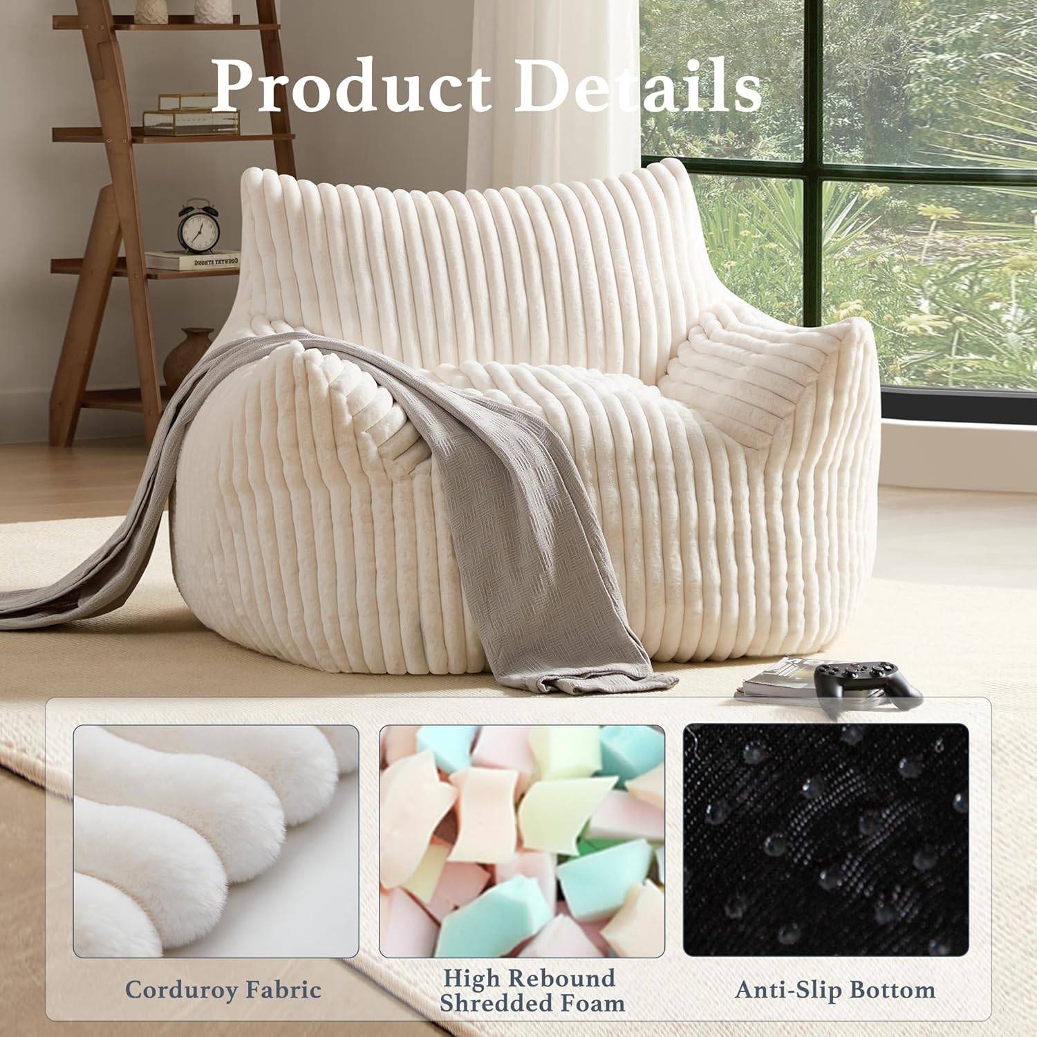 Ultimate Comfort: Filled with high-resilience shredded foam, this oversized bean bag chair offers a unique blend of softness, support, and a snug, cocoon-like feel. Perfect for lounging, reading, or using as a comfy gaming chair, it’s designed to elevate your relaxation experience.