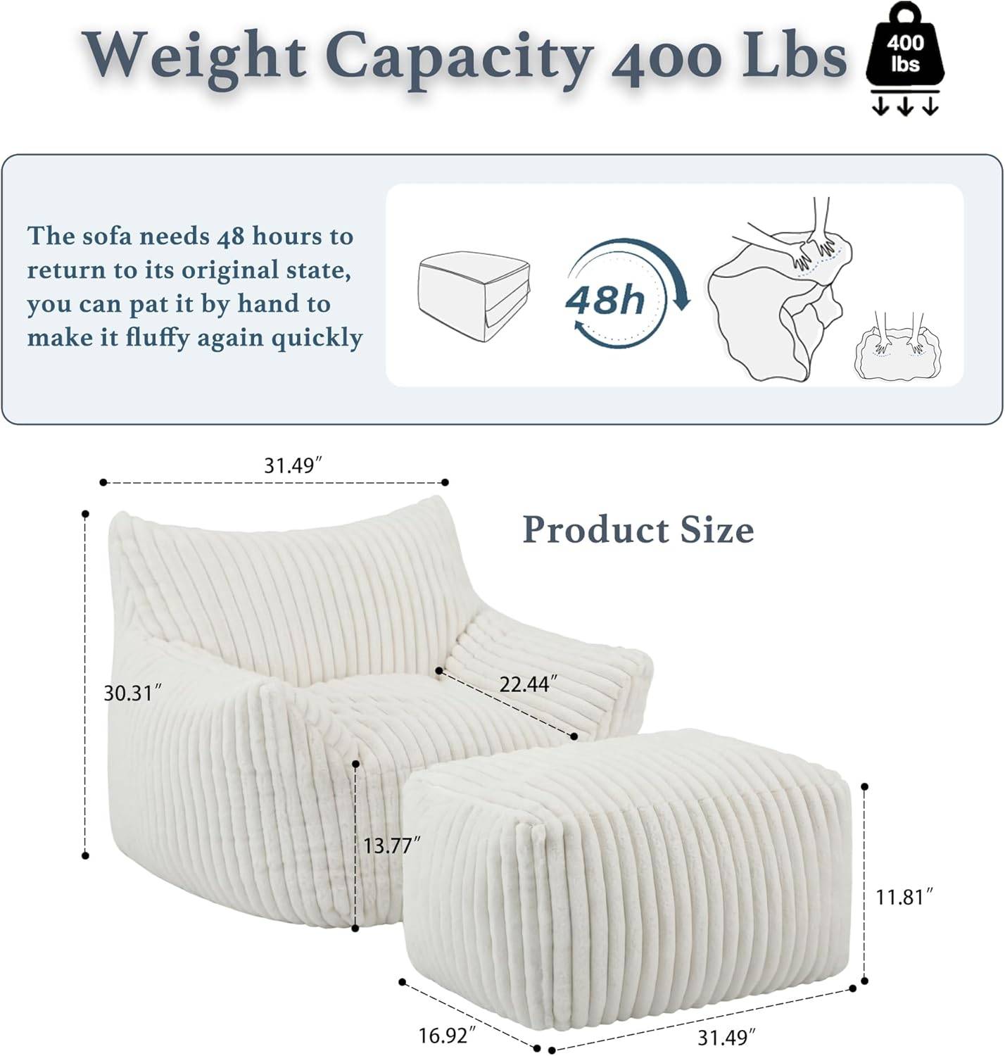 Spacious and Roomy: Designed wide 4 feet, up to 400Lbs Weight capacity to accommodate adults and teens of the most of sizes, this foam bean bag provides ample space to stretch out or share with a friend. Its family room bean bag appeal makes it ideal for relaxing alone or hanging out with others. The bean bag's Dimension is 46.06"D x 38.58"W x 29.53"H.